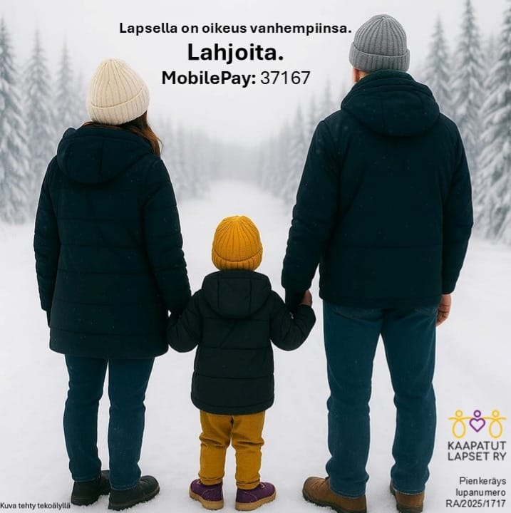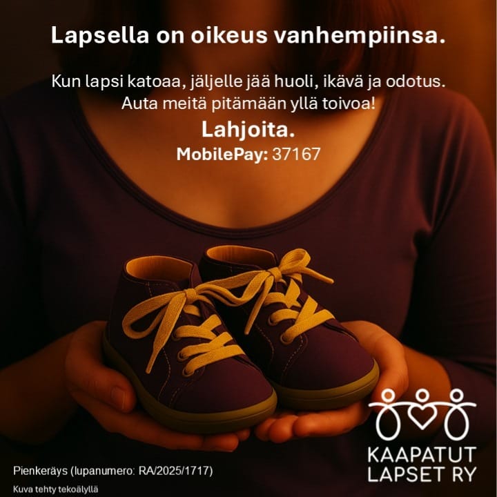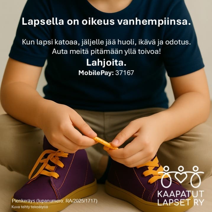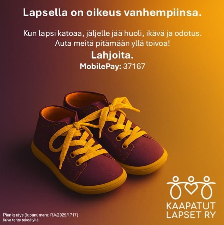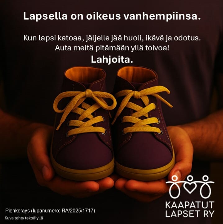 Keräys toteutetaan 20.11.–18.02.2026 Kaapatut Lapset ry:n pienkeräysluvalla.